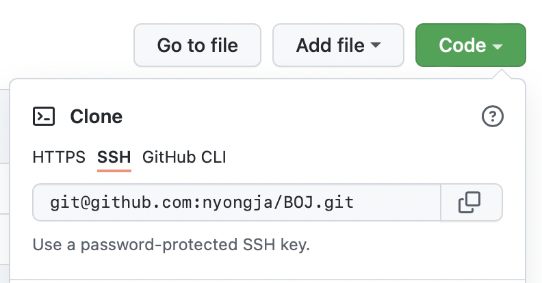 예를 들어 (https://github.com/nyongja/BOJ) 해당 레파지토리를 가져오고 싶다면