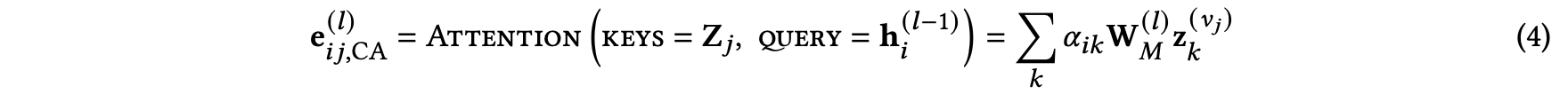 이는 content-attention vector $e^{(l)}_{ij, CA}$는 content $Z_{v_j}$에 attention mechanism을 사용하여 계산하게 됩니다.