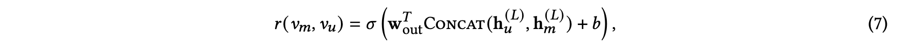 사용자 노드 $v_u$와 아이템 노드 $v_m$ 사이의 edge를 예측하기 위해서는 GNN의 output으로 나온 user와 item node embedding을 concat하여 아래의 layer를 통해 구할 수 있습니다.