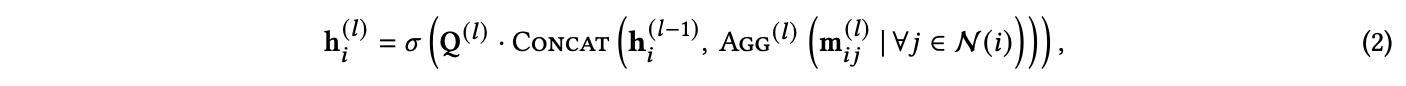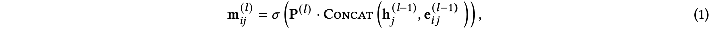 즉, 노드 $v_i$로 오는 메세지는 노드 $v_i$의 이웃 노드인 $v_j$들간의 edge embedding과 $v_j$의 node embedding의 concat 된 값이라는 거죠.