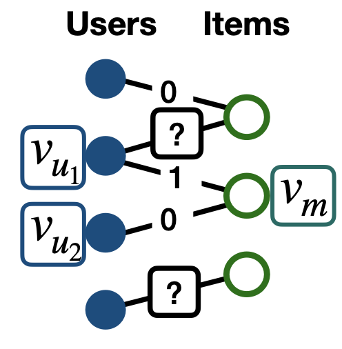 예를 들어, 아래와 같이 user와 item 사이 missing edge 값을 예측하는 GNN이 있다고 가정해봅시다.